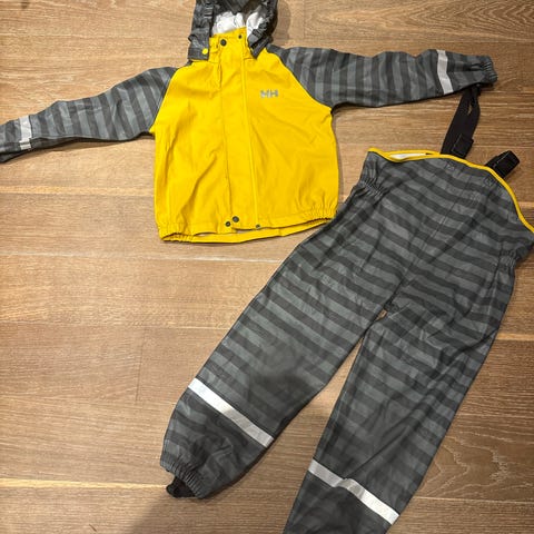 Helly Hansen regntøysett for barn i størrelse 104. Sett med regnjakke og regnbukse i polyester. Jakken er gul med kontrastfargede ermer, hette og refleksdetaljer. Regnbuksen har seler, justerbare stropper og refleksdetaljer. Unisex-modell egnet for bruk i vått vær og utendørs lek. Hetten kan tas av.
