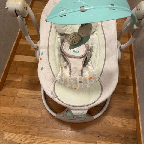Elektrisk vuggestol / babystol i grått med myk, lys innvendig polstring. Stolen har integrert sikkerhetssele for baby, samt avtagbar bøyle med myke leker hengende over sitte- og liggedelen. På fronten er det betjeningspanel med knapper for ulike funksjoner, som eventuelt lyd eller vibrasjon (avhenger av modell).