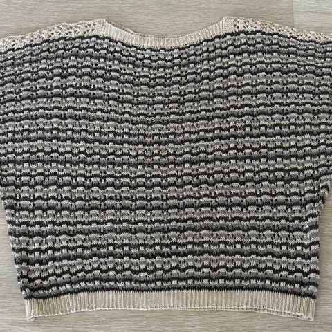Deilig hjemmestrikket genser med raglan og korte ermer i hvit med blågrå melering. Strikket i kidsilk (75% mohair super kid og 25% silke) og alpakka. Deilig og myk. Str ca M. Ubetydelig brukt, som ny. Selges kr 800,-