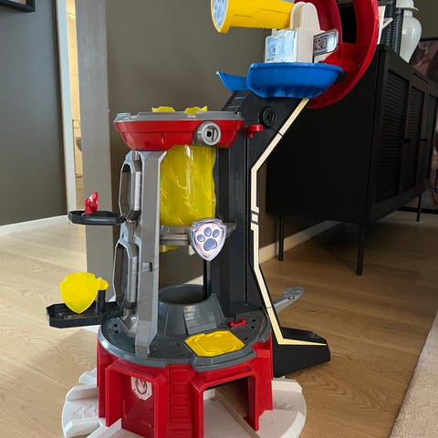 Paw Patrol utkikkstårn i plast. Tårnformet lekesett med flere etasjer og ramper til kjøretøy. Fargekombinasjon hovedsakelig i rødt, blått og grått, med karakteristiske Paw Patrol-detaljer. Egnet som lekesett for barn som liker Paw Patrol-universet.
