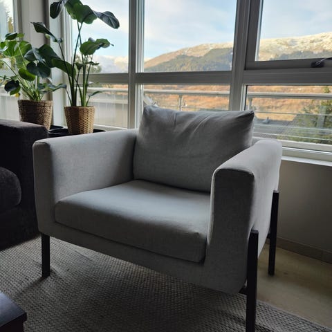 Pent brukt Brunstad sofa og 2 lenestoler med puff. Stolene er litt falmet på baksiden.