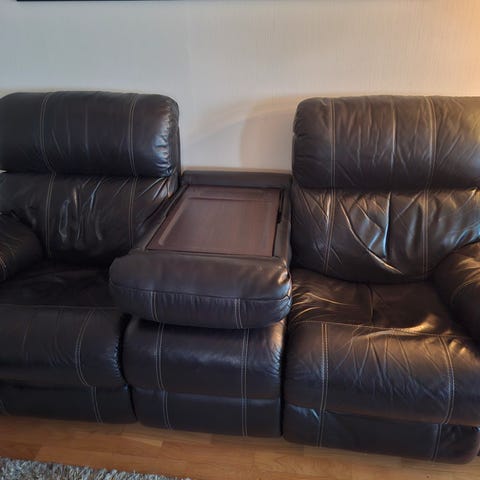 Selger en behagelig 2-seters reclinersofa i mørkebrunt skinn. Begge setene har recliner-funksjon med fothviler, så her sitter du veldig godt enten det er til TV, film eller bare avslapping.