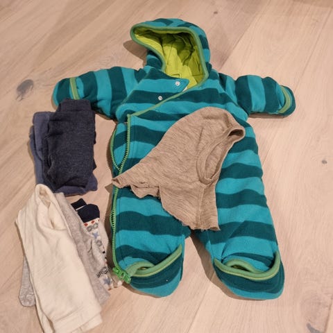 Hjemme Strikket ulldress i Marius mønster. Dekorative knapper. God og varm, passet min som akkurat har vokst ut av str 68, passer nok str 62 og.