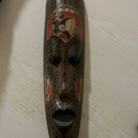 Utskåret veggmaske i tre med markerte ansiktstrekk og åpne øyne og munn. Masken har utskårne detaljer rundt ansiktet og en buet øvre kant dekorert med en rødlig bakgrunn og små blomsterlignende ornamenter. Fargene er hovedsakelig naturtre, mørkebrunt og rødt, med enkelte metallfargede detaljer rundt øynene. Baksiden er glatt med enkel opphengssnor, tilpasset for å henges på vegg. Passer som dekorativ veggpryd i for eksempel stue, gang eller hobbyrom.