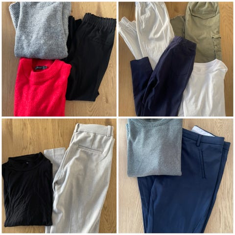 Klærpakke med cargo pants, hvit tynn genser, blå stram tights/bukse, hvit behagelig bukse.