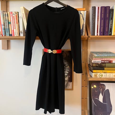 Filippa K hverdagskjole for dame i størrelse S. Kjolen er svart og laget i polyester. Modellen har lange ermer og rund hals. Egner seg som enkel hverdagskjole og kan styles med belte eller andre tilbehør etter ønske. Uten belte.