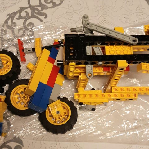 LEGO Technic byggesett med ulike gule og noen grå deler. Settet inneholder tekniske klosser, plater, bjelker og hjulkomponenter som kan brukes til å bygge og modifisere tekniske modeller. Passer for bygging av kjøretøy eller andre konstruksjoner innen LEGO Technic-serien.