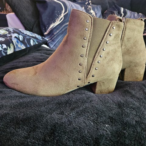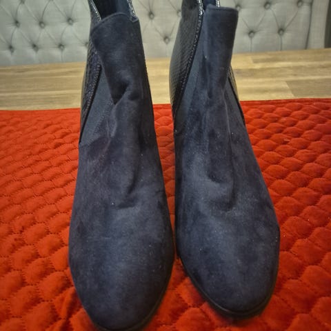 Selger et par blå ankelstøvler i semsket skinn-lignende materiale. De har en lav, blokkformet hæl og en funksjonell glidelås på siden med en rund glidelåsring i sølvfarge.