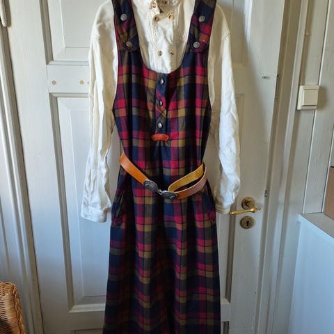 Skjorta er offwithe/kremfarget med pene broderier foran og langs kraven.Behagelig å ha på,stikklommer på siden på kjolen.