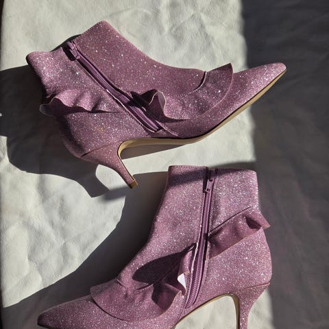 Ankelstøvletter i størrelse 40. Modellen er ankelhøy med smal hæl og spiss tå. Skoene har sølvfarget glitterfinish og glidelås på siden for enkel av- og påkledning. Passer til bruk ved anledninger der man ønsker et mer pyntet uttrykk.