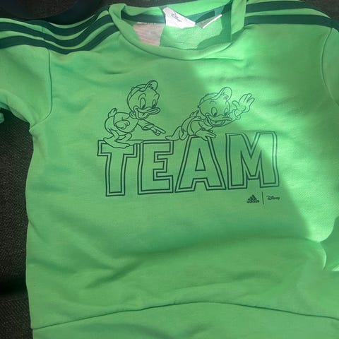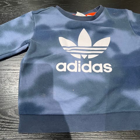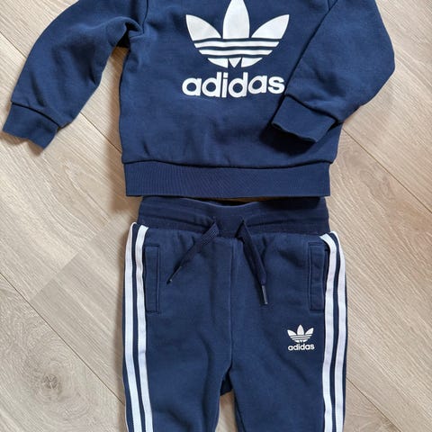 Adidas joggedress for barn i størrelse 92, unisex. Sett med hettegenser og joggebukse i blå farge. Genseren har hette og ribbekanter ved ermer, og Adidas-logo på bryst og rygg. Joggebuksen har elastisk linning med snøring, ribbekanter nederst på beina og Adidas-logo på låret. Passer til hverdagsbruk og fritidsaktiviteter.