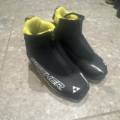 Fischer langrennsstøvler i størrelse 29. Modellen er beregnet for klassisk langrenn og har kraftig såle med feste for langrennsbindinger. Skoene er i fargene svart og gul med snøring foran og høy ankelstøtte. Innside med polstret fôr for økt komfort og hemper bak for enklere av- og påtaking.