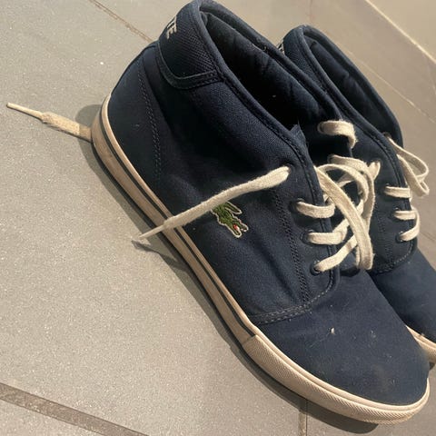 Lacoste sko i størrelse 42. Skoene er i blå farge med hvit såle og snøring. Modellen har middels høy ankel og klassisk Lacoste-logo på siden. Egnet som fritids- eller hverdagsko.