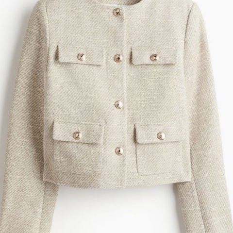 Helt ny, Ellos blazer for dame i størrelse 36. Jakken er beige og laget i polyester. Modellen har rund hals, lange ermer og en lett figursydd passform. Den har blanke, runde knapper foran og innfelte lommer med klaff. Blazeren er helfôret og har tynne skulderputer. Egner seg godt til bruk både til hverdags og mer formelle anledninger.