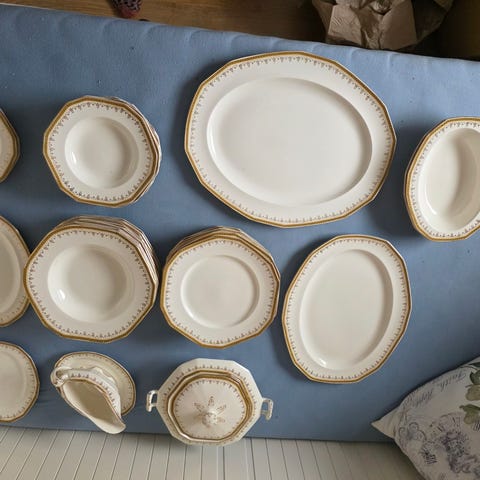 Nydelig strøkent middagsservise Gul Marie fra Figgjo. 12middag, 10 dype og 11 dessert tallerkener. Div. fat saueterrin og potetbolle.