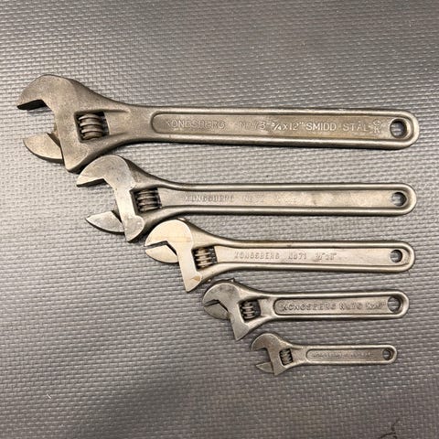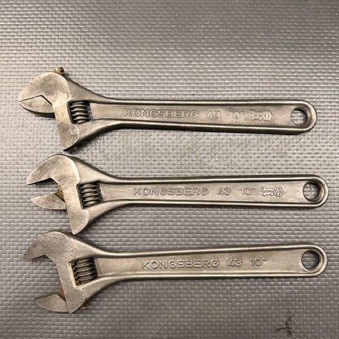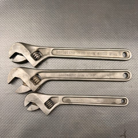 Tre stk Kongsberg skiftenøkler i smidd stål, ulike størrelser. Solid, tradisjonell norsk kvalitet med god tyngde og presis justering. Dette er verktøy laget for hard bruk og lang levetid.
