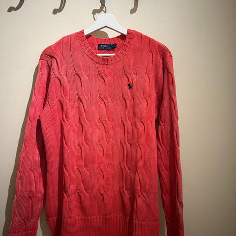 Polo Ralph Lauren genser for dame i størrelse M. Genseren er blå og strikket i bomull med flettestruktur. Den har v-hals og ribbestrikkede kanter nederst og på ermene. Passer til hverdagsbruk og kan kombineres med både bukser og skjørt. Veldig pent brukt,noen få ganger. Fargen er ujevnt men genser er laget sann.