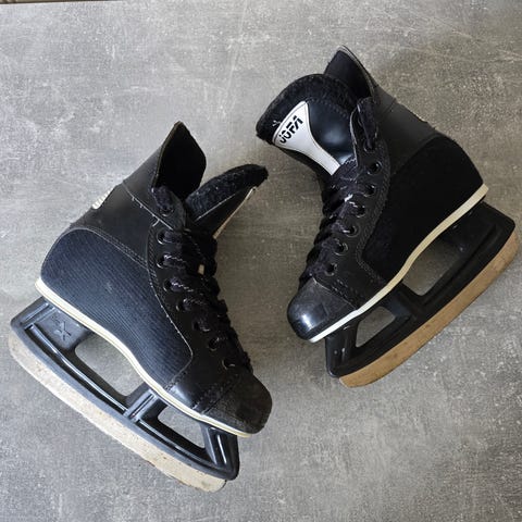 Jofa ishockeyskøyter for barn i størrelse 34. Klassisk modell i svart med høyt skaft og snøring med mange maljer for god tilpasning rundt ankelen. Skøytene har faste stålskinner tilpasset ishockey. Uten skolisser. Må hentes .