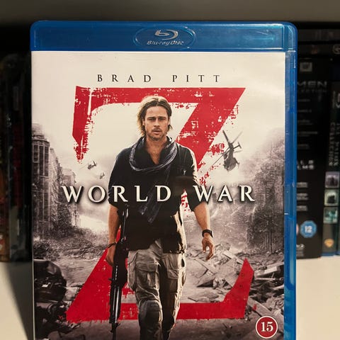 World War Z Blu-ray film. Action- og katastrofefilm med aldersgrense 15 år. Fysisk utgave på Blu-ray-plate, egnet for avspilling på Blu-ray-spillere som støtter denne filmtypen.