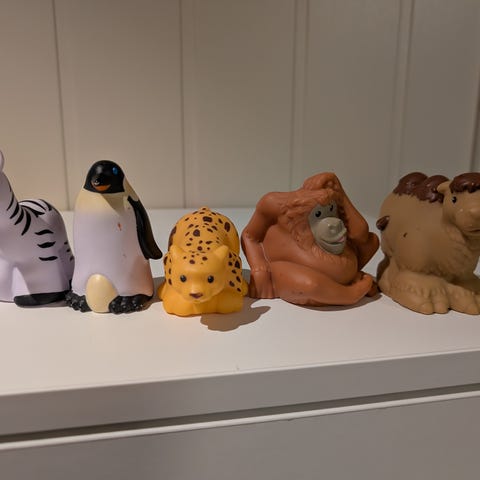 Vi selger mange forskjellige dyr som barna har vokst fra. Dyrene er i plast. Ikke noe spesielt merke.