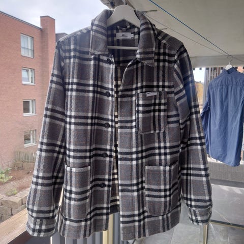 Moods of Norway jakke for herre i størrelse M. Jakken er grå og laget i ull og polyestermateriale med glatt fôr på innsiden. Den har hette, glidelåslukking foran og flere lommer både utvendig og innvendig. Passer som ytterjakke i kjøligere vær og til hverdagsbruk.