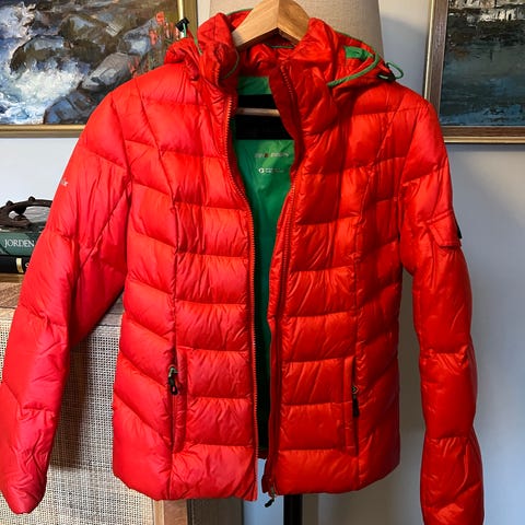 Peak Performance lang dunjakke for dame i størrelse M. Jakken er svart og fylt med dun. Den har hette, gjennomgående glidelås foran og lommer i siden. Ermene har ribbestrikkede mansjetter. Passer som varmt ytterplagg i kaldt vær.