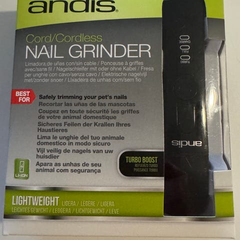 Nail Grinder elektrisk klosliper for kjæledyr. Batteridrevet enhet med slipehode og beskyttende plastdeksel rundt slipedelen. Har innebygd lys ved slipehodet. 2 hastigheter.