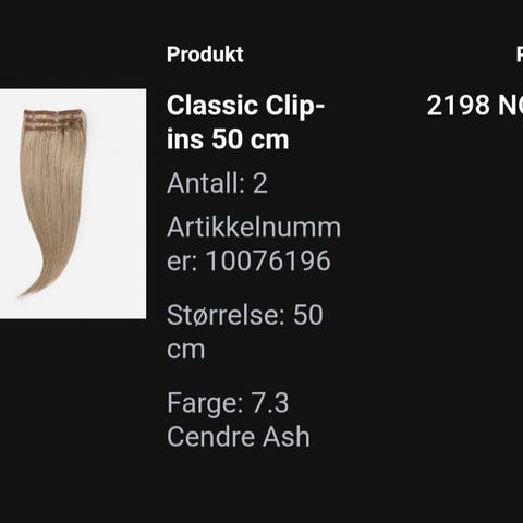 Selger clip-ins i fargen chocolate brown, 40 cm. Jeg har bare prøvd dem på og hatt dem i håret i kanskje 2 timer. De er i veldig god stand, som nye.
