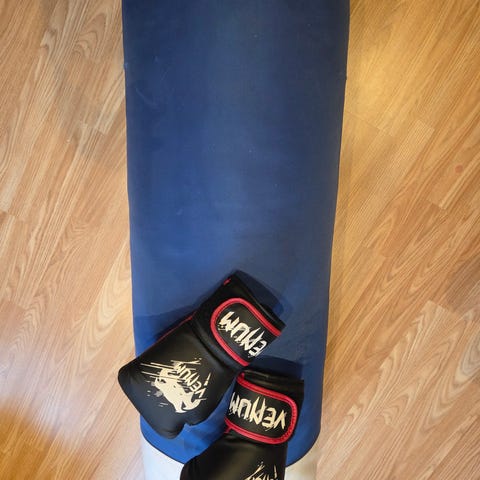 Kjøpt for mange år siden i Bergen. Utstyret har vert morro å ha i hus, spesielt for en liten, energisk og glad gutt. De siste årene har utstyret ikke blitt brukt så mye, så da trengs ny eier. Sekken veier ca 22kg og ser flott ut. Hanskene som følger med er nokså lite brukt. Det kjem også med et feste til sekken som ikke er avbildet. Trenger litt sterkere verktøy for å få den ned, men det fikser jeg snarest.