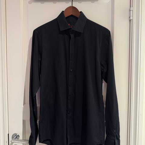 Skjorte for herre i størrelse M. Skjorten er svart med et diskret prikkemønster på forsiden. Materiale i bomull. Langermet modell med klassisk krage og knappelukking foran. Passer til både hverdagsbruk og mer formelle anledninger.