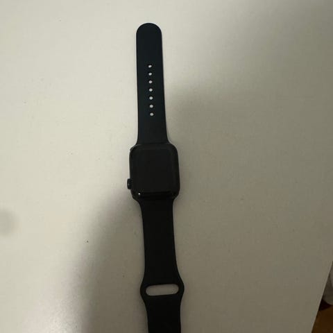 Apple Watch smartklokke med rektangulær skjerm og digital krone på siden. Klokken leveres med en vevd, elastisk rem i flerfarget mønster med gule, grønne og oransje toner. Baksiden har optiske sensorer for pulsmåling. Egnet til daglig bruk, aktivitetssporing og varslinger fra tilkoblet iPhone.