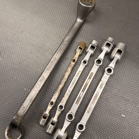 Selger et parti solide fastnøkler fra DOWIDAT. Klassiske, eldre industrinøkler i grovt stål, laget for hard bruk. Dette er ikke moderne lettvektsverktøy, men tunge og slitesterke nøkler av typen som varer i flere tiår.