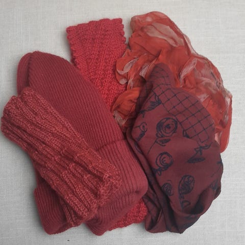 Lue i ull, pannebånd i ull og to lette skjerf i bomull