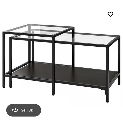 IKEA sofabord i moderne, åpen konstruksjon. Bordet har bordplate i klart glass og underhylle i mørk overflate, med svart metallramme. Rektangulær form med rette linjer gir et nøytralt uttrykk som passer til ulike stiler i stue eller oppholdsrom. Underhyllen gir ekstra plass til oppbevaring av bøker, magasiner eller annet tilbehør.