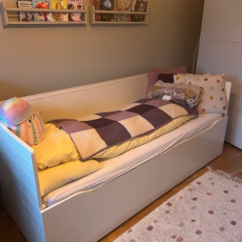 IKEA dagseng med skuffer i svart treverk. Sengen har rygg- og sidepanel med sprosser og to uttrekksskuffer under liggeflaten for oppbevaring av sengetøy eller annet. Passer som enkeltseng eller dagseng i soverom, gjesterom eller oppholdsrom. NB: Sengen kan ikke lenger trekkes ut til dobbeltseng. Overflaten har synlige spor etter normal bruk, og det må settes i en skrue/vinkeljern på hver side (se bilde nr.2). Madrass (80 x 200 cm) medfølger ikke.