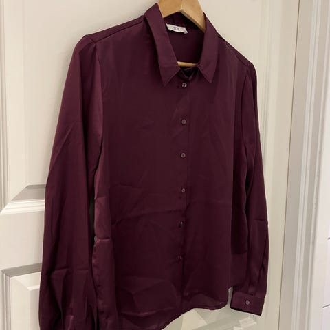 Pen Gant skjorte for herre i størrelse M, laget av bomull. Skjorten er vinrød og har klassisk krage og knappelukking foran. Ermene avsluttes med mansjettknapper. Passer til bruk i hverdagen eller til mer formelle anledninger, og kan kombineres med både bukse og jeans.