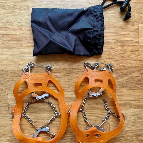 Kjøpte disse til barna for flere år siden - ble aldri brukt, bare prøvd på. Brodder med svært kraftig grep. Tilsvarer størrelse 33-36