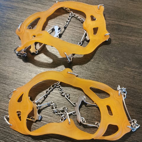 Broddene passer på alt fra fjellstøvler til joggesko på grunn av den særs tøyelige elastomerstrikken som trekkes rundt lesten på foten.