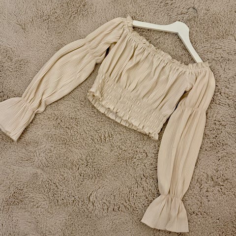Gina Tricot genser for dame i størrelse S. Genseren er beige og laget i polyester. Den har rund hals, lange ermer og rynket/strukturert materiale både på bol og ermer. Passer til hverdagsbruk eller til enkle antrekk der man ønsker en lett og behagelig genser.