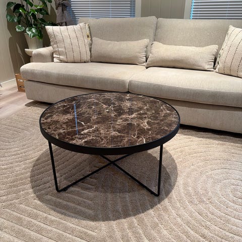 Izmir marmor sofabord fra Bohus, kjøpt nytt i 2021 for 5000kr, pent brukt og vært dekket til med transparent kontaktplast hele tiden (denne kan lett tas av/skiftes). Understellet er sveiset selv da vi opplevde at det originale var ustabilt. Lakket svart. Veldig lite bruksmerker og marmorplaten har som sagt vært beskyttet hele veien.