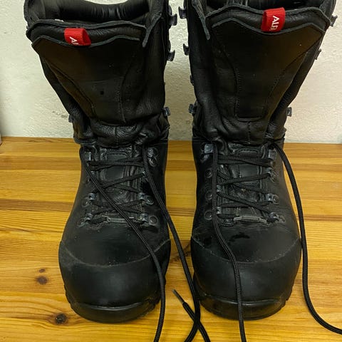 Alfa Bever 1.0 Advance fjellstøvler i størrelse 45. Støvlene er laget i brunt skinn med forsterkninger i tåpartiet og kraftig yttersåle med grovt mønster. Modellen har Gore-Tex-membran for vannavvisende og pustende egenskaper. Overdelen har høyt skaft med flere kroker for snøring som gir god ankelstøtte. Egnet til bruk i skog og fjell, som angitt på merkelappen (Forest/Mountain).