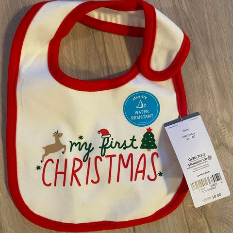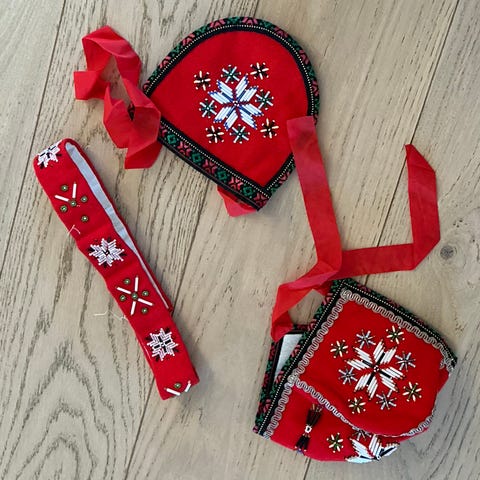 To julesmekker selges samlet. Den ene er fra name it med skriften «Nissens lille hjelper» og den andre er hjemmesydd med rødt stoff med snøkrystaller. Fra røyk- og dyrefritt hjem.