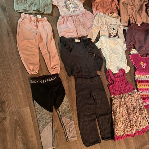 Newbie babyklær for jente i størrelse 56. Pakken inneholder flere plagg i ulike farger, blant annet 1 bodyer, 4 bukser og 1 kjole. 3 bukser er fra Newbie strl 56, 1 bukse er fra Nameit strl. 62.