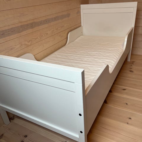 IKEA juniorseng med sprinkelsider og innebygde skuffer under sengen. Sengen har høye gavler og tette lang- og kortsider med sprosser som gir god støtte for madrass og sengetøy. Under sengen er det tre uttrekksskuffer som gir ekstra oppbevaringsplass til for eksempel sengetøy, leker eller klær. Nøytral lys farge som passer inn i de fleste barnerom. Egnet som juniorseng for barn som har vokst ut av sprinkelseng.