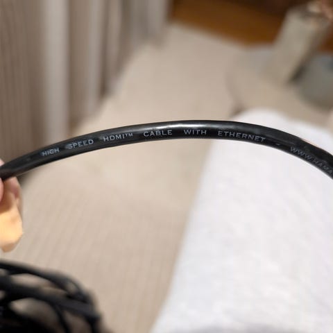 En 10 meter lang HDMI-kabel fra Hama. Kjøpt på Elkjøp i desember, men ikke brukt fordi den var litt for kort. Som ny.