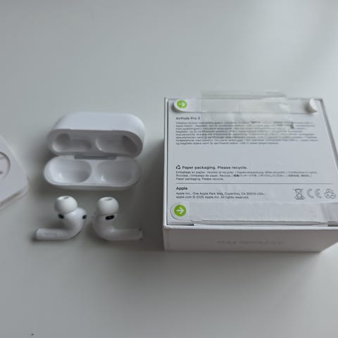 Apple AirPods Pro Gen 3 helt trådløse hodetelefoner i hvit farge. Modellen leveres med ladeetui og silikonpropper for bedre passform og støydemping. Hodetelefonene kobles trådløst til kompatible Apple-enheter og andre enheter som støtter Bluetooth. Egner seg til daglig bruk, musikk, samtaler og andre lydtjenester. På bildene vises også et separat brunt skin beskyttelsesetui til ladeetuiet.