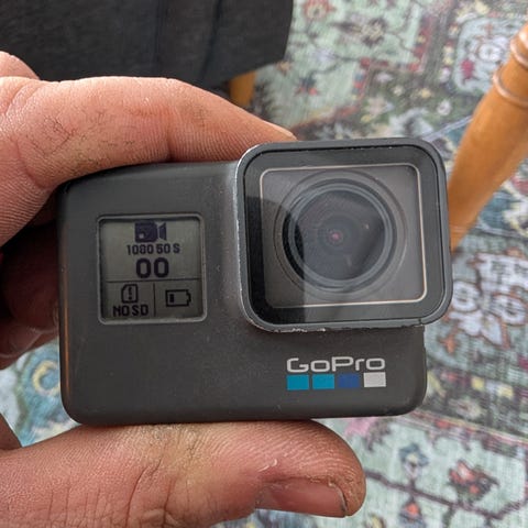 GoPro actionkamera i grå farge. Kompakt kamera med frontlinse og berøringsskjerm på baksiden. På bildene følger det med flytende håndgrep og rammefeste som kan brukes til montering. Egnet til opptak av video og bilder i ulike aktiviteter, både på land og i vann når det brukes med riktig tilbehør og hus etter behov.