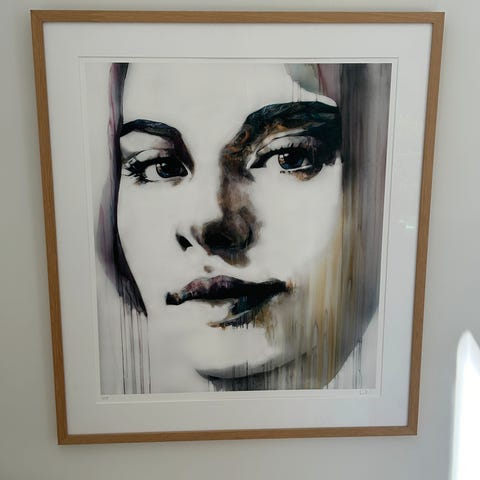 Portrettbilde, moderne maleri, tidsriktig maleri, rammen har sølv/nikkel-look og passer derfor godt til art deco stil. Fargene er ellers fine til fargerik boho.