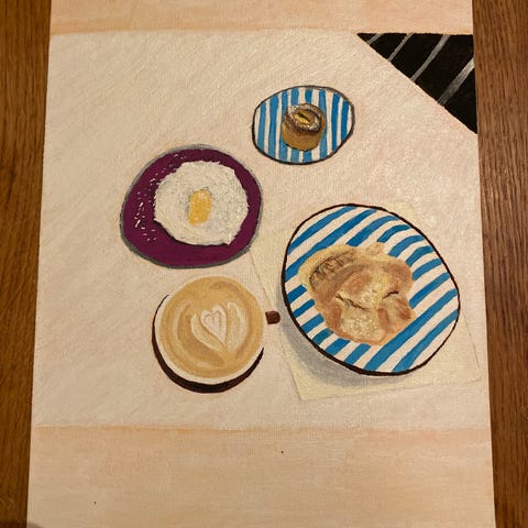 "KVINNE MED KAFFEKOPP OG UTSIKT", Kvadratisk maleri med struktur og ungdommelig utrykk. 72,5x72,5