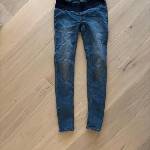 Esprit mammabukse olabukse i bomull, størrelse 36 (jeg bruker 38 vanligvis). Buksen har mørk denimfarge og elastisk magepanel som gir plass til voksende mage. Smal passform i bena. Egnet som hverdagsbukse for gravide.